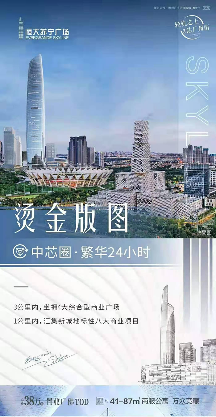 | 團購動態:共有101人團購報名!佛山恒大蘇寧廣場推出41-87方商業公寓 總價38萬 3站廣州南,3公里內坐擁四大綜合型商業廣場。1公里內匯集新城地標性八大商業項目!燙金版圖+4商業+8總部,中芯圈繁華24xxss!在線團購享受優惠!看房請提前預約! |